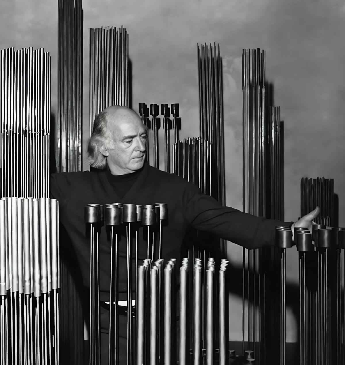 Harry Bertoia with one of his sound sculptures.