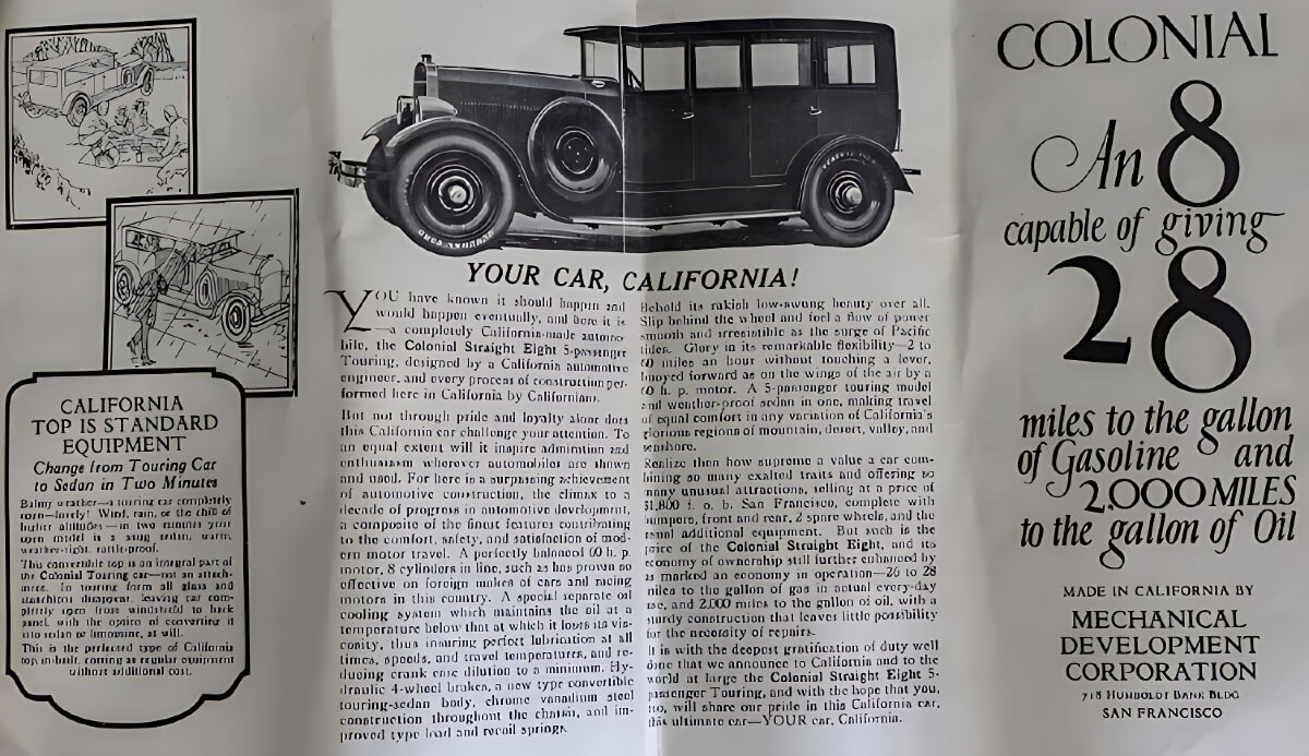 It was built by MDC, the Mechanical Development Corp of San Francisco, and was the first car built on the nation’s west coast.
