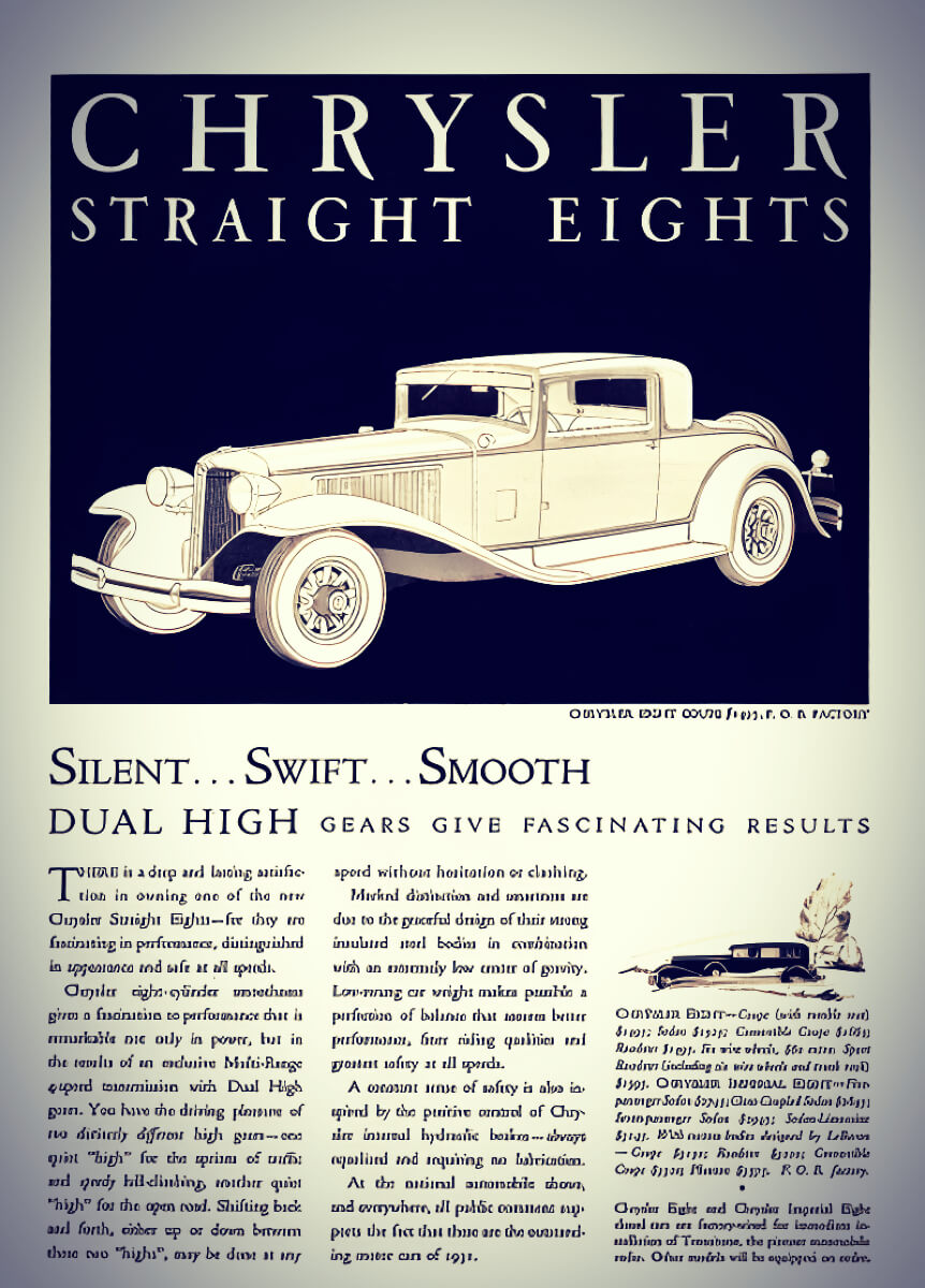 In the early 1930s, Chrysler offered several of its “Eight” series models, divided into the Series CP Eight and the higher-end Series CH and CL Imperial Eights.