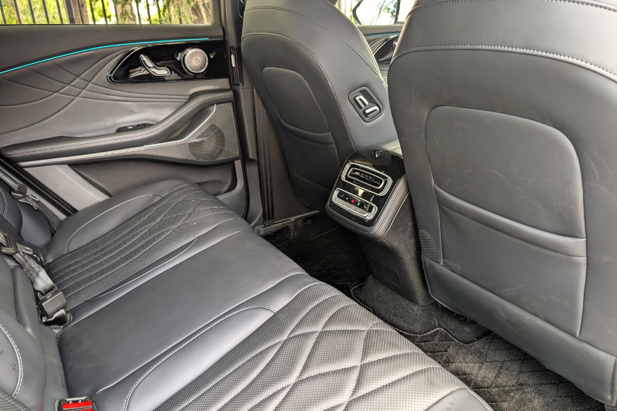 The door-mounted seat controls are a lift from Benz, but fore and aft control is for show only in the rear.